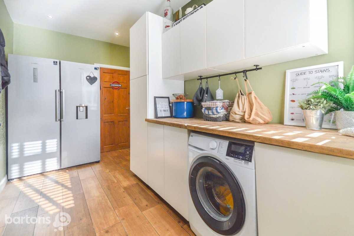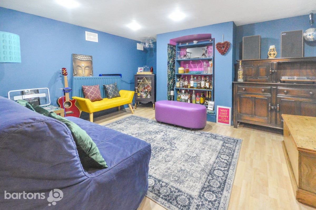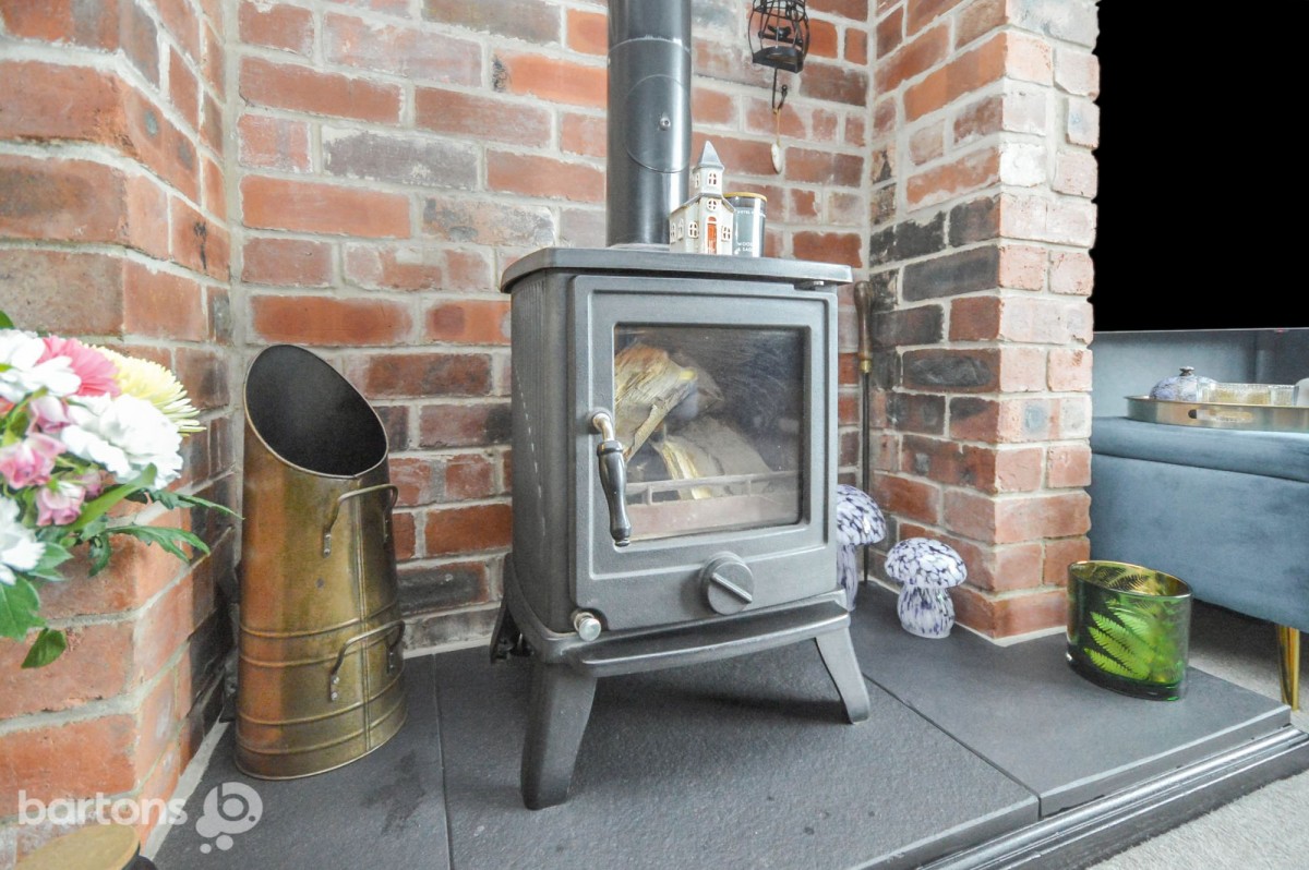 Internally, the accommodation is arranged over four levels. The entrance hall opens into a stylish open-plan living space, featuring a cosy lounge with a log-burning stove set within a feature fireplace, a dining area, and a fitted kitchen complete with integrated appliances. There is access to a downstairs WC, a useful utility room and steps leading down to a converted cellar, which benefits from electrics and gas central heating—offering excellent additional living or storage space.