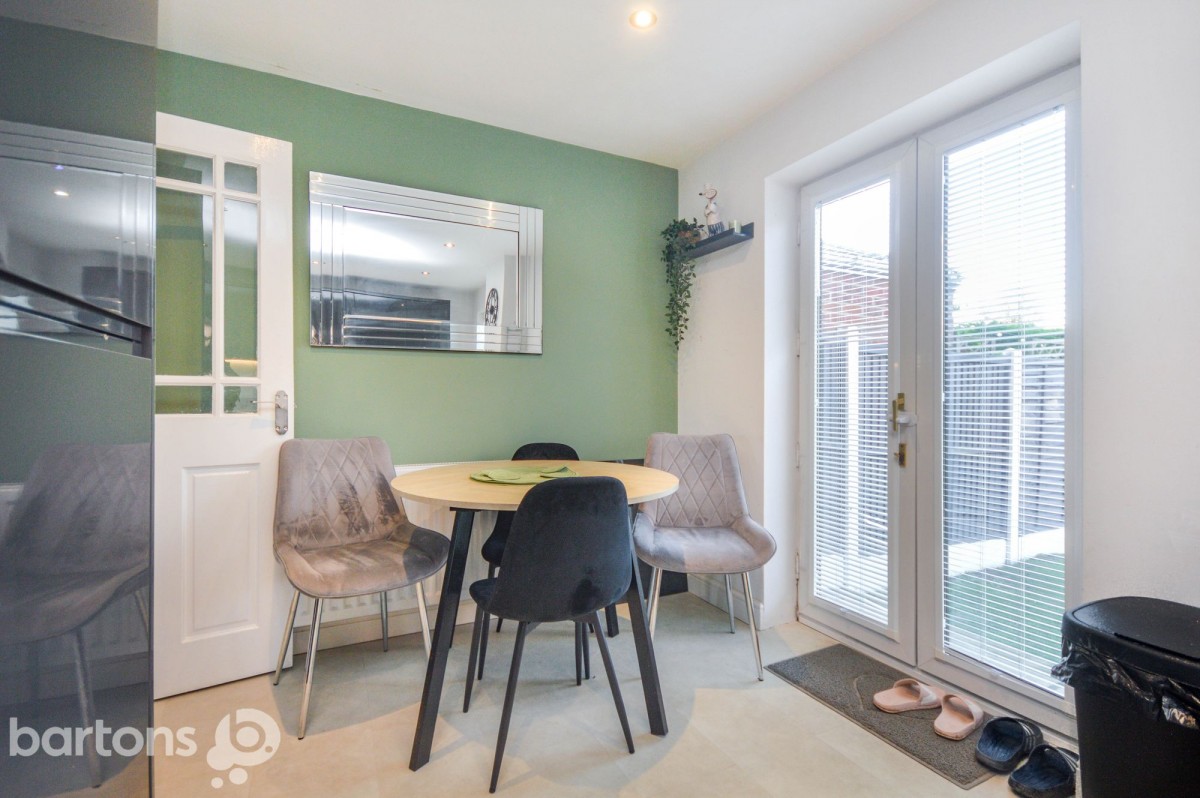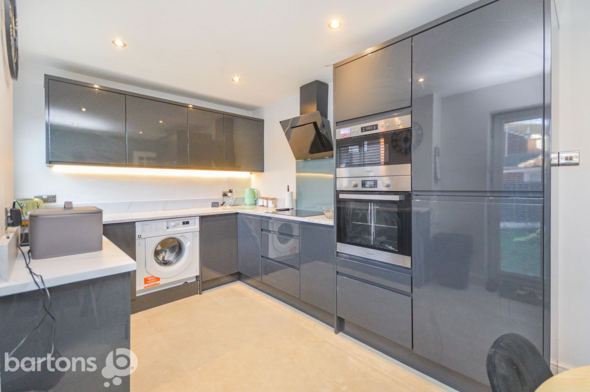 The Entrance Hall opens into a cosy Lounge filled with natural light from bright uPVC Double Glazed windows and features practical under-stairs storage. The Lounge flows effortlessly into the sleek open-plan Kitchen Diner, which has been finished to an exceptional standard. The newly installed grey gloss Kitchen creates a modern, high end feel and comes fully equipped with built in appliances including an Induction hob, Fridge freezer, Washing machine, Oven and Microwave. This space is designed for both cooking and entertaining, with French doors that provide lovely views overlooking the peaceful Garden.