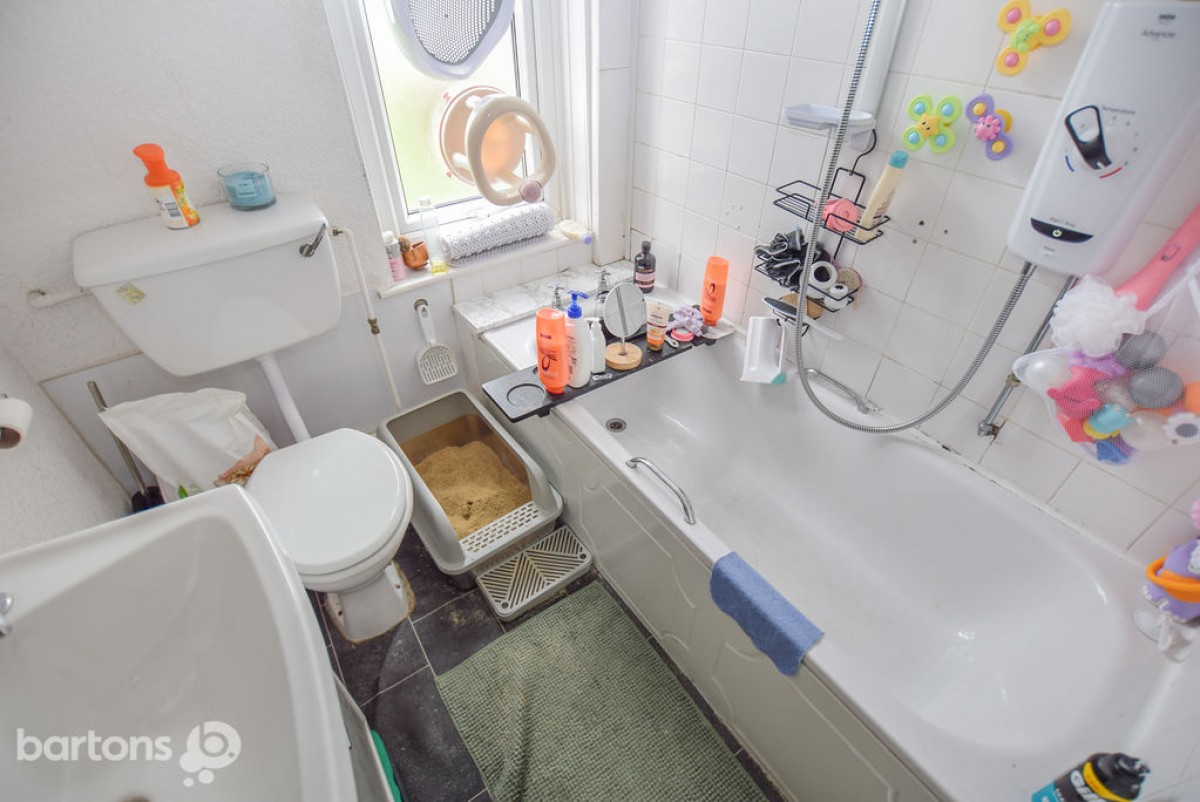 It comes with a light and airy Lounge, benefiting from both front and rear aspect windows, has a smart fitted Kitchen in a gloss white finish with built-in appliances including a mid-level oven, hob & extractor, fridge and separate freezer. There is also a convenient downstairs Bathroom which is appointed with a suite in white with an over bath electric shower and attachments. The first floor has two double sized bedrooms.